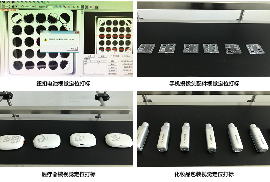 本技術(shù)運(yùn)用了視覺(jué)定位原理,先對(duì)產(chǎn)品進(jìn)行模板制定,保存為標(biāo)準(zhǔn)模板,在加工時(shí)對(duì)產(chǎn)品進(jìn)行拍照,由計(jì)算機(jī)對(duì)比及位置定位,調(diào)整后即可對(duì)產(chǎn)品進(jìn)行精確加工。所加工的產(chǎn)品外形可以是圓形、方形、非規(guī)則形狀都可以識(shí)別;這種工藝特別適合小產(chǎn)品,可免除定位料盤(pán)、固定夾具的加工,大大節(jié)省了激光打標(biāo)加工周期。可根據(jù)實(shí)際產(chǎn)品工藝要求選配不同類(lèi)型激光器。